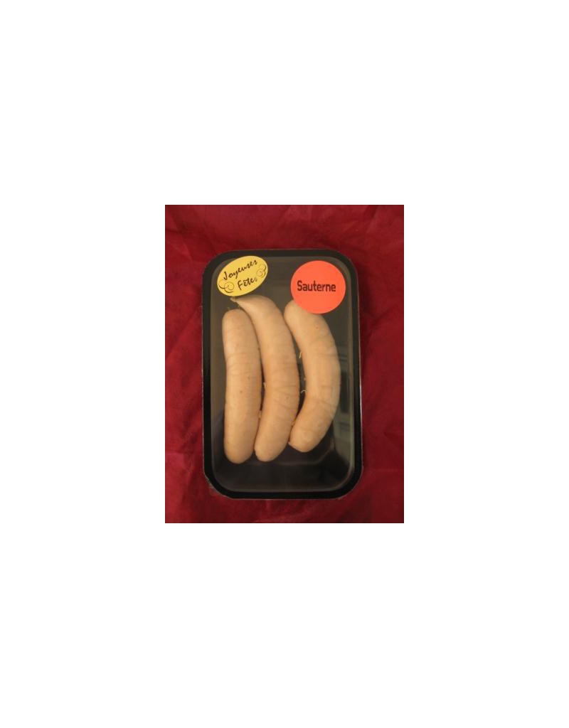 - Gras de porc, lait stérilisé UHT (lactose), viande de dinde, blancs d’œufs reconstitués, protéines de lait (lactose), sel, Sauternes AOC 1% (sulfites), farine de blé (gluten), arômes naturels (dont poivre), Stabilisants E450i, E451i et E450iii, épices, dextrose, Antioxydant E316. Boyau naturel.